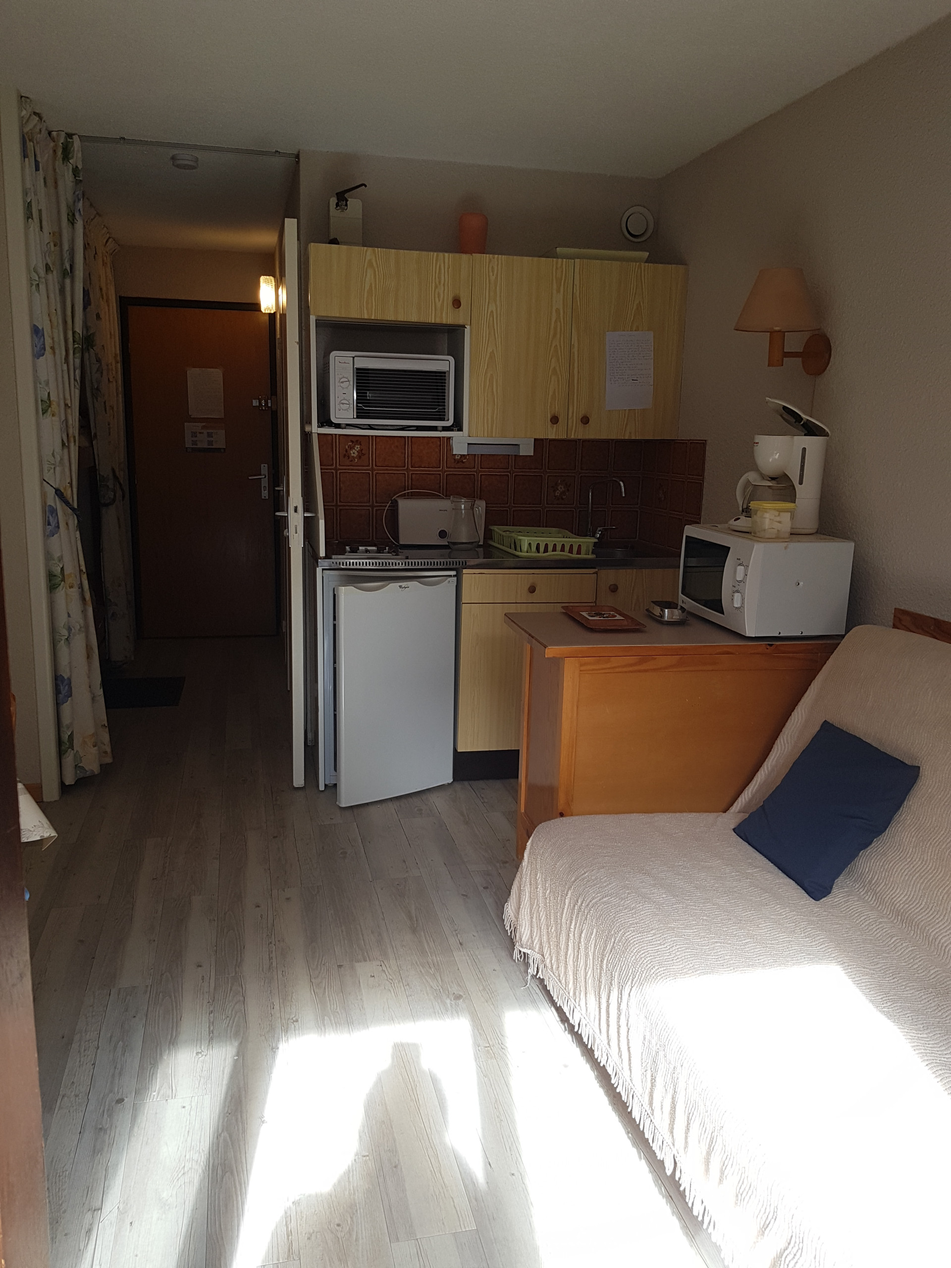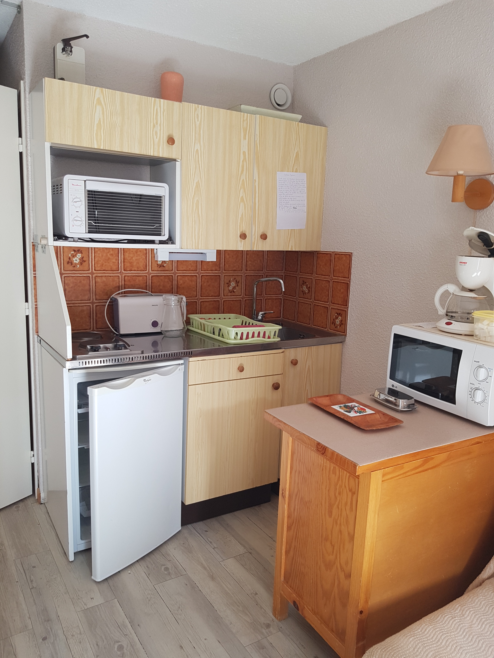 Kitchenette equipped with two electric hobs, mini-oven, microwave, fridge, Nespresso \'Krups\' coffee maker, toaster, kettle, raclette appliance, fondue set, crepe maker