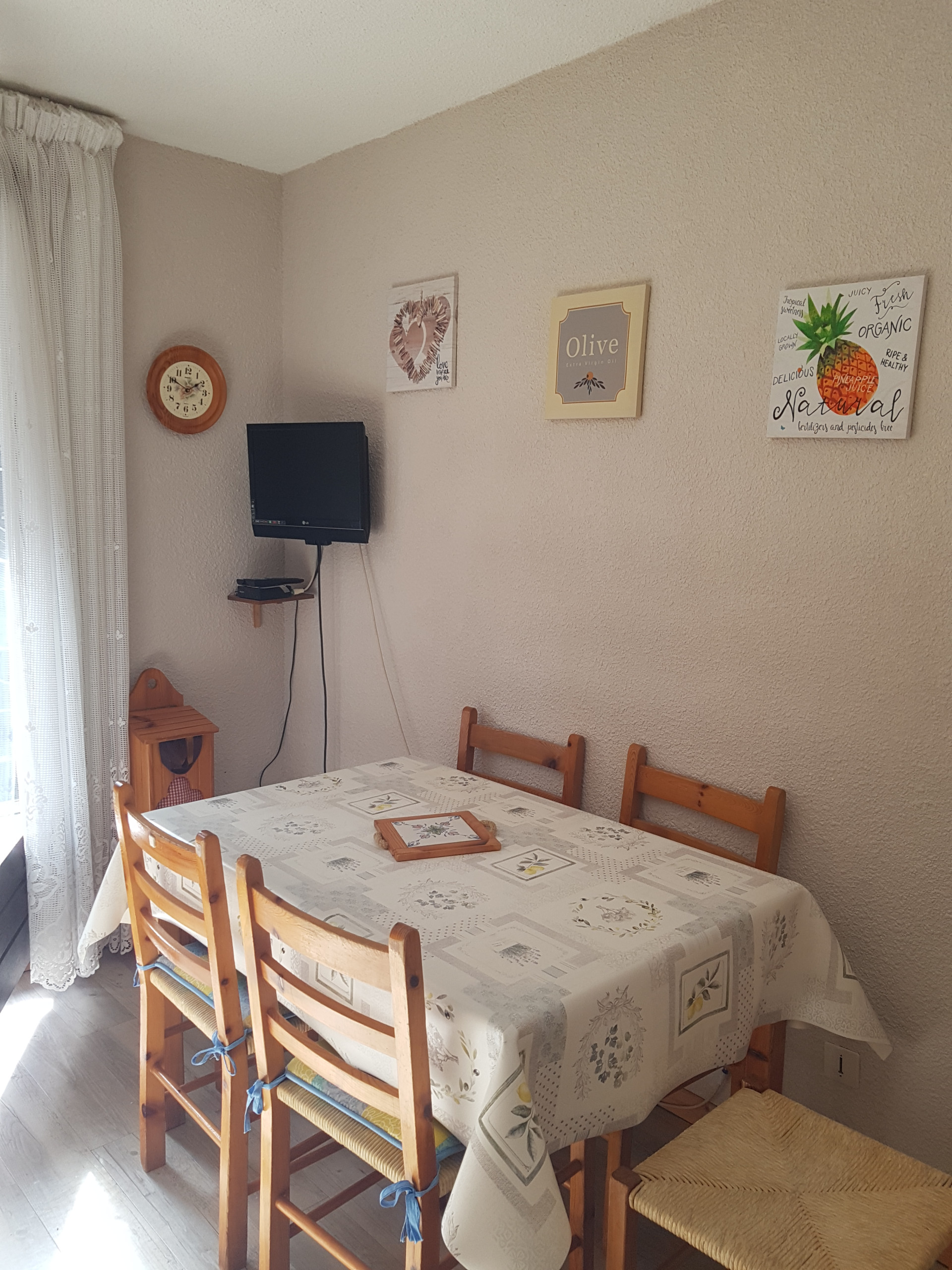 Living room equipped with a 140cm sofa bed, table, chairs, a flat-screen TV, a French window giving access to a south-facing balcony with garden chairs and tables.