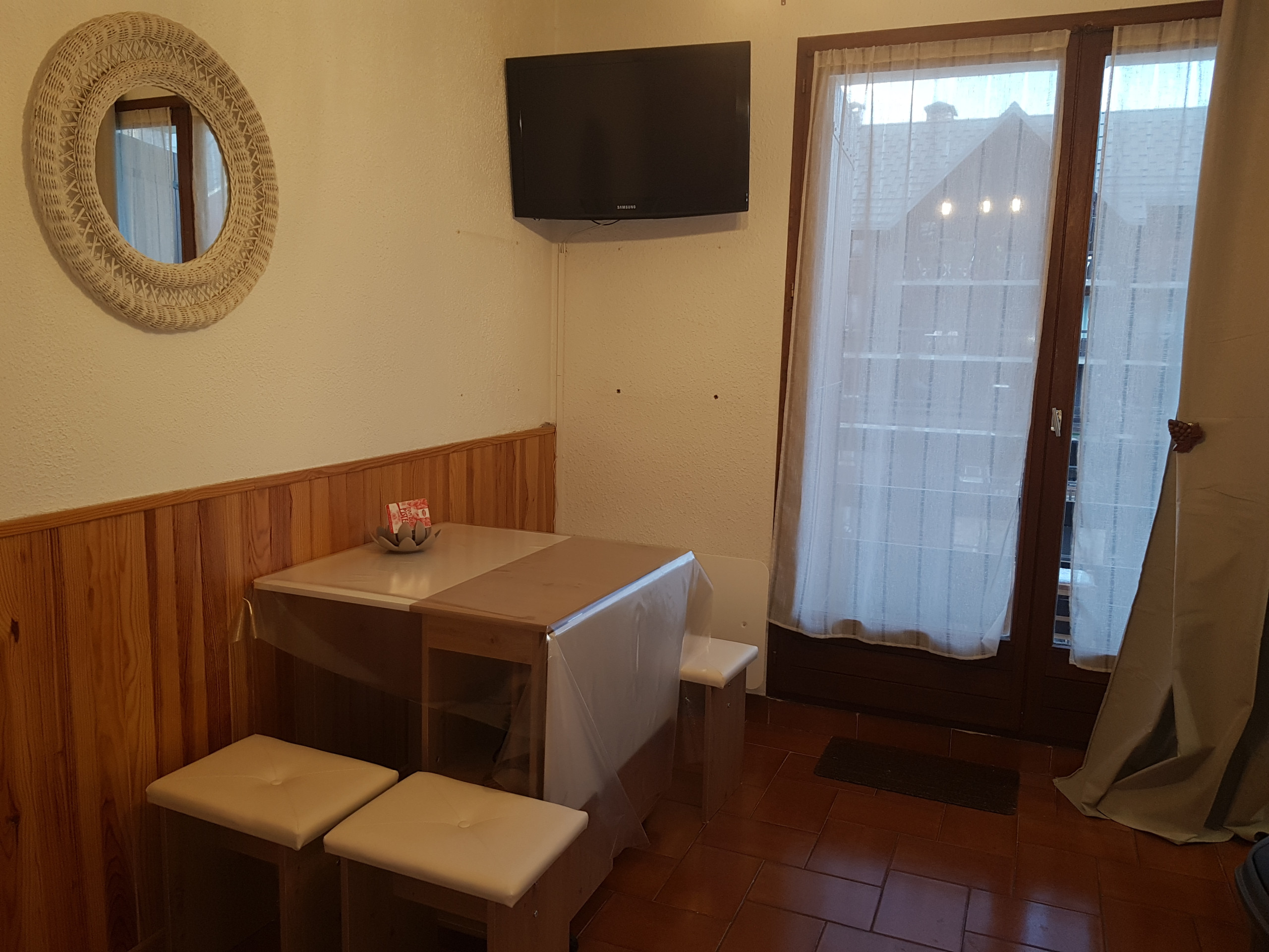 Living room equipped with a table and chairs, a 140 cm Rapido sofa bed, a flat-screen TV and a door window giving access to the north-facing balcony