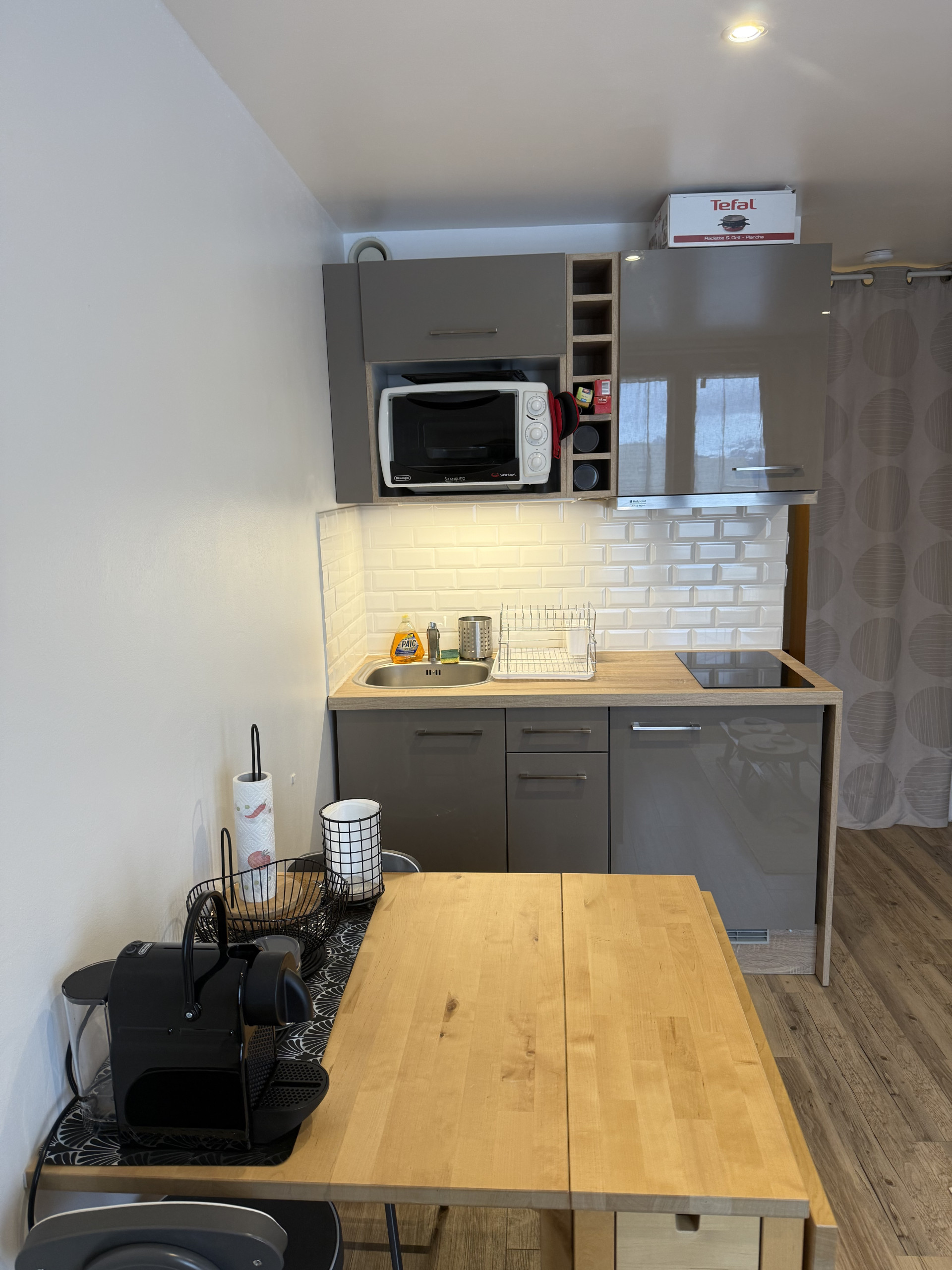 the kitchen, refrigerator, dishes/cutlery and coffee machine are provided.