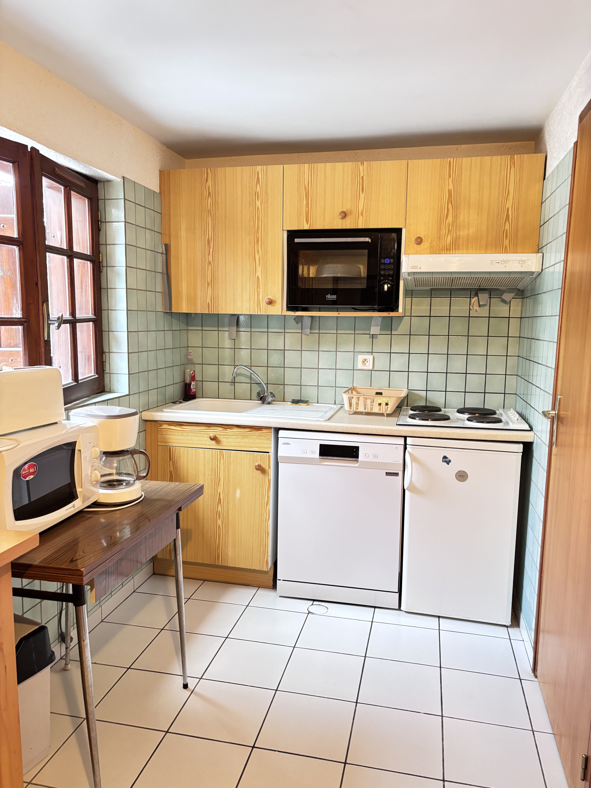 La cuisine, Électrique, est équipée avec réfrigérateur, micro-ondes, lave-vaisselle, vaisselle/couverts, ustensiles/cuisine, cafetière et grille pain.