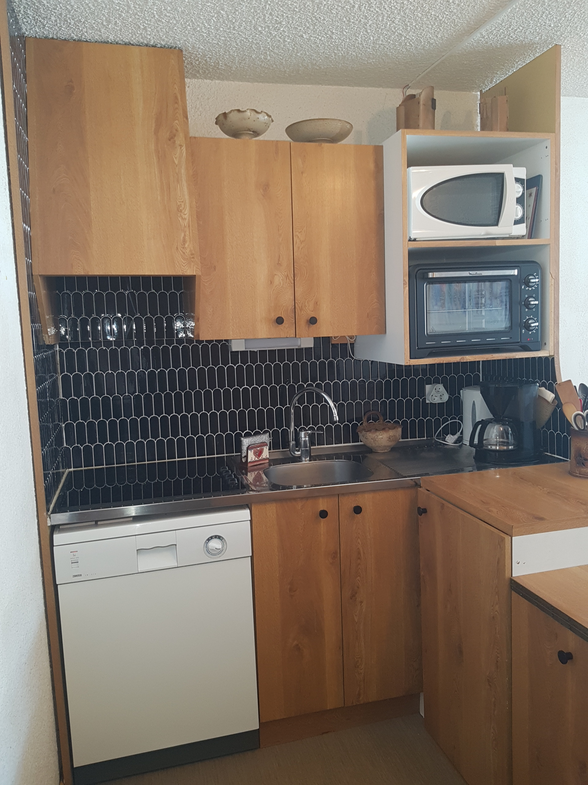 Kitchenette équipée d’un four, 4 plaques électriques, réfrigérateur, lave-vaisselle, micro-ondes, cafetière électrique « filtre », bouilloire, grille-pain