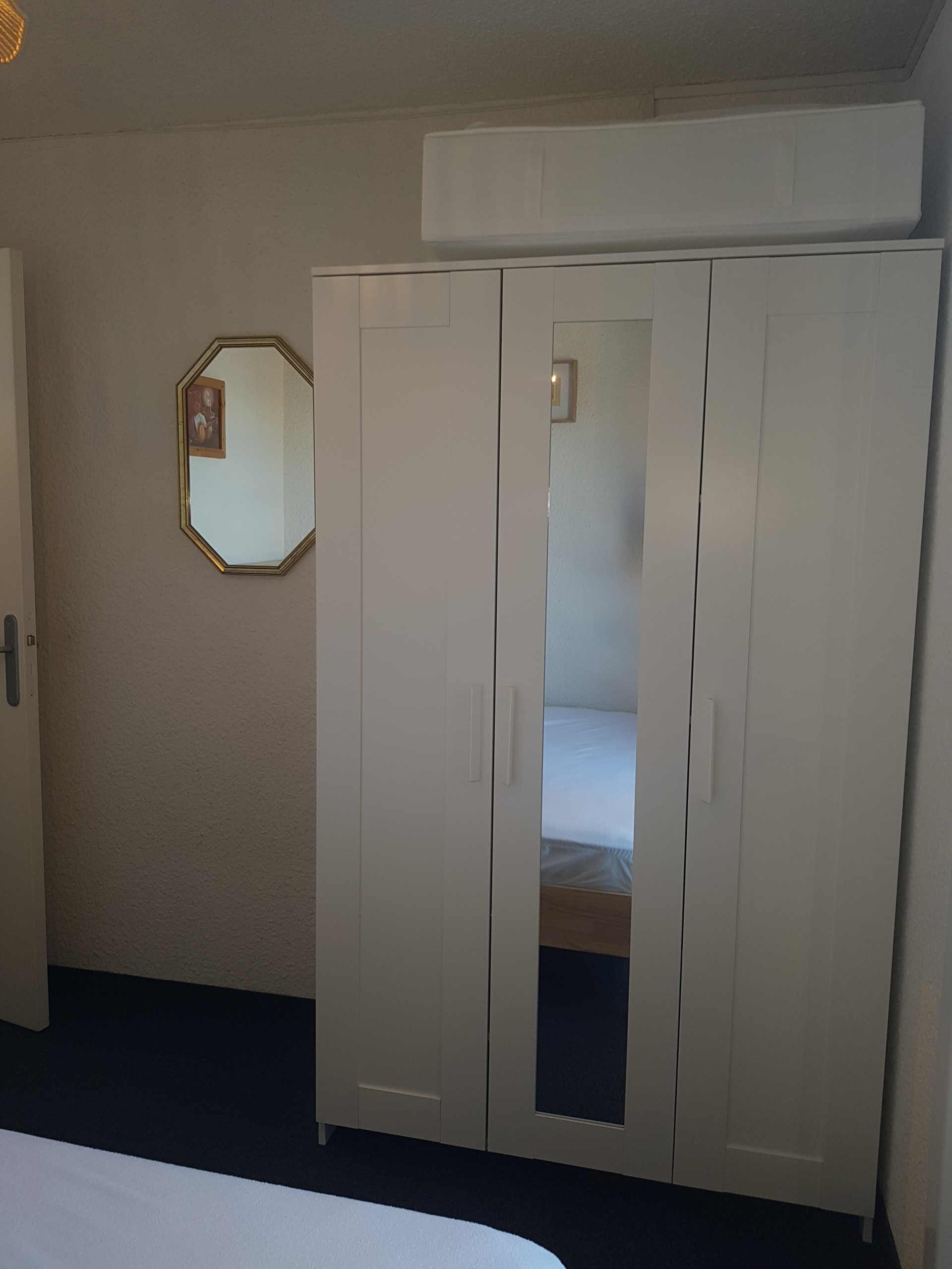 Chambre équipée d’un canapé gigogne, d’une armoire de rangement et d’une TV écran plat
