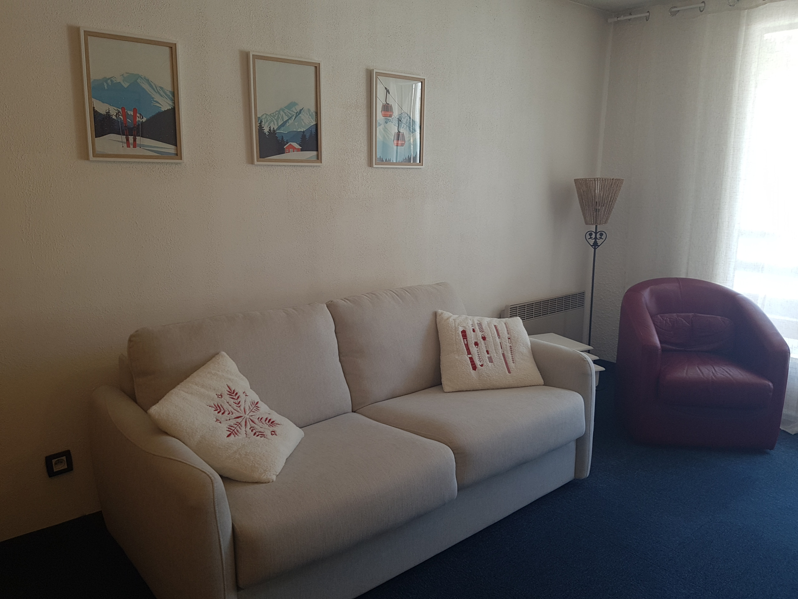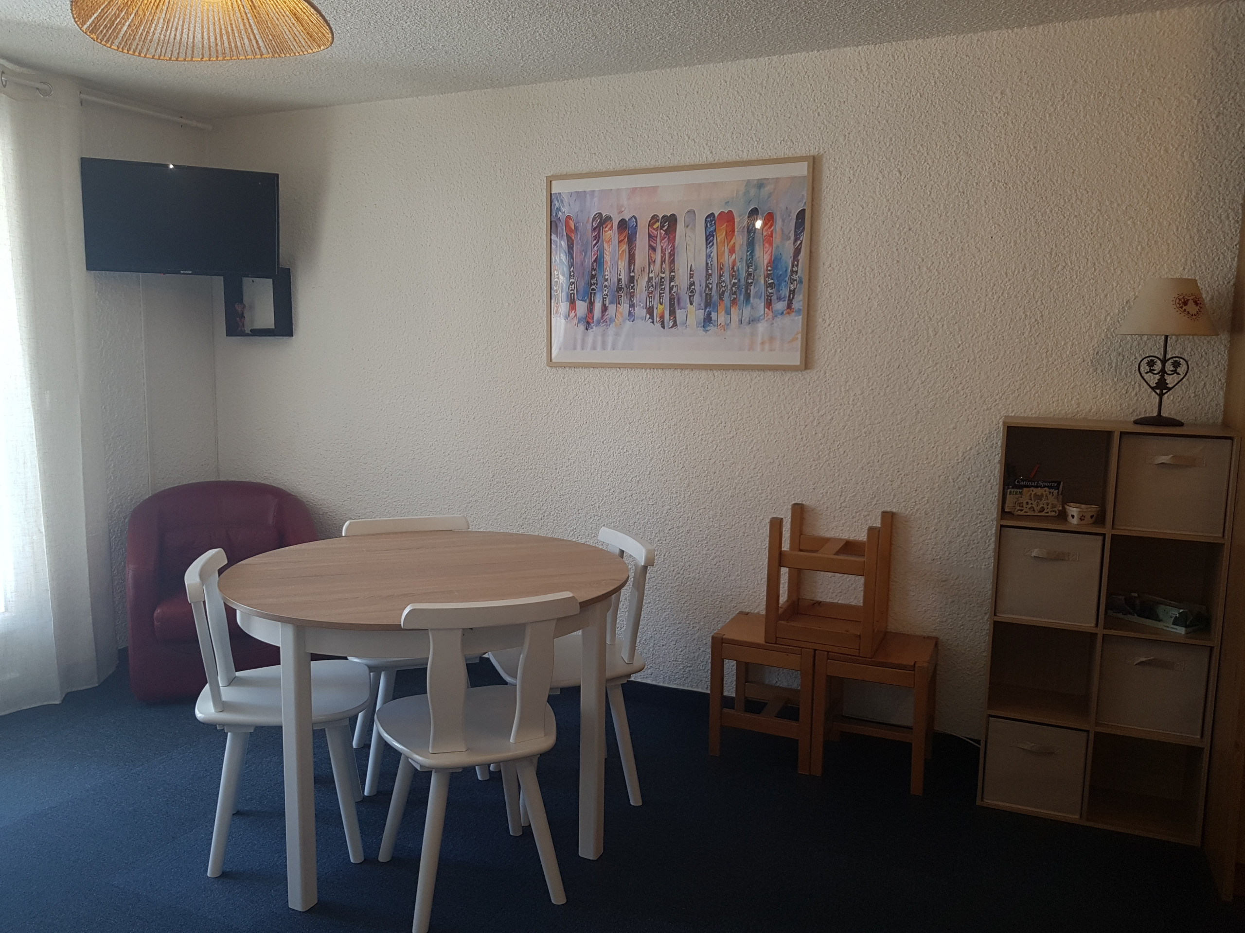 Séjour équipé d’un clic clac en 120cm, une TV écran plat, meuble de rangement, table et chaises, porte fenêtre donnant accès sur un balcon exposé Sud.