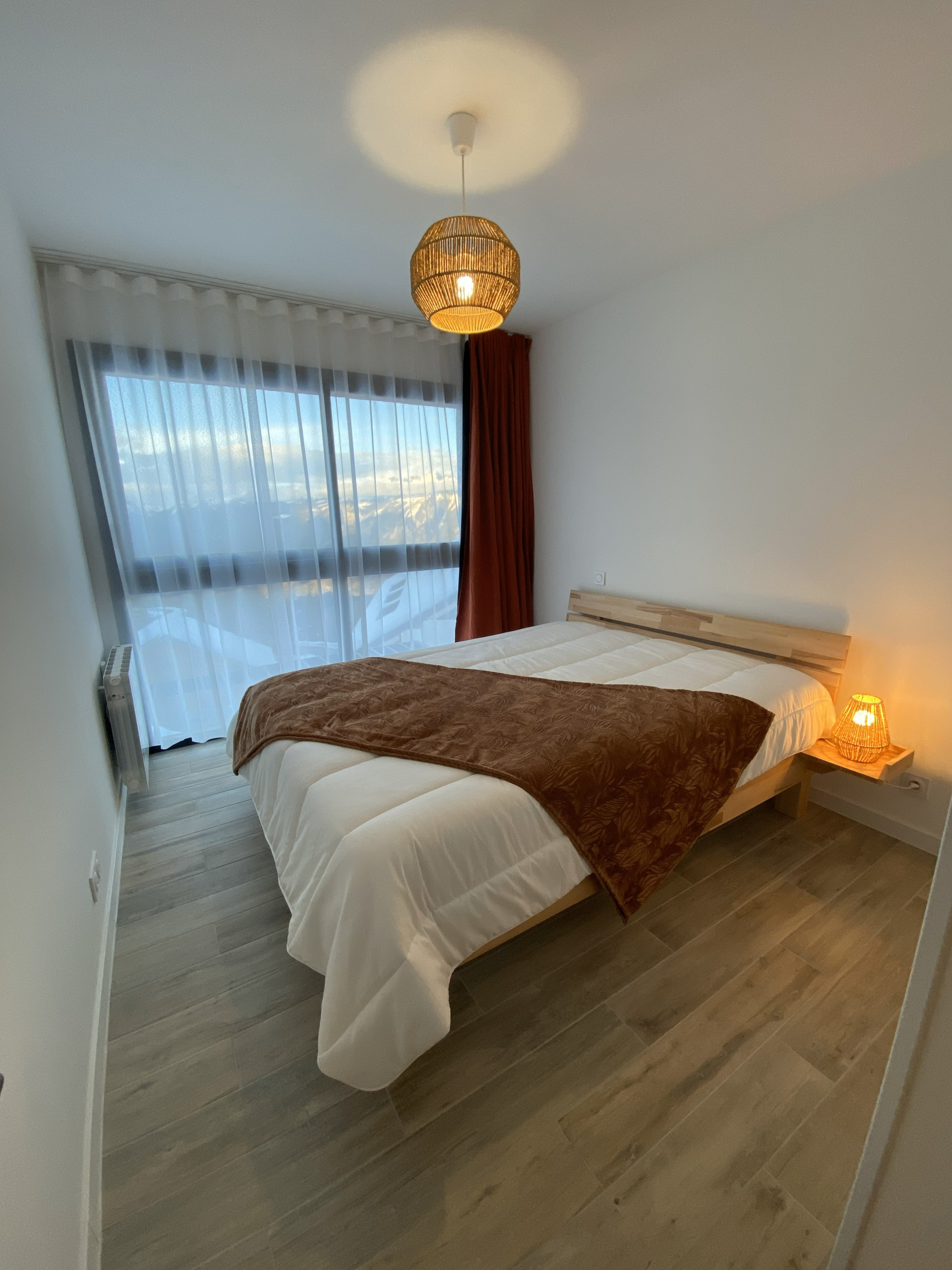 Chambre parentale 3 fermée par une porte, équipée d’un lit double en 160 x 200 cm, liseuses avec chargement USB, TV écran plat, placard/penderie, d’un velux et d’une fenêtre avec stores occultants donnant sur le séjour